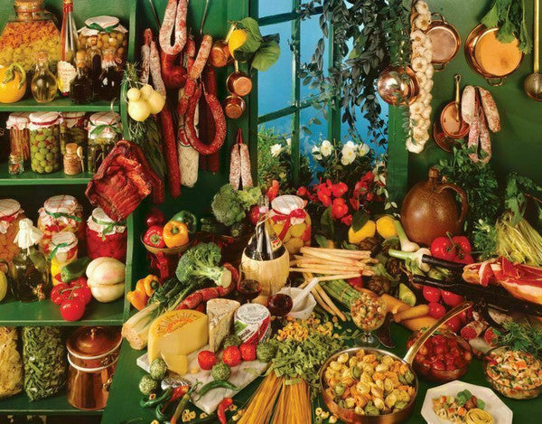 Immerse yourself in the sights, and imagine the tastes and smells in this puzzle. This image of a kitchen bursting with food and flavors is filled with a riot of different colors that will make it a delicious challenge!